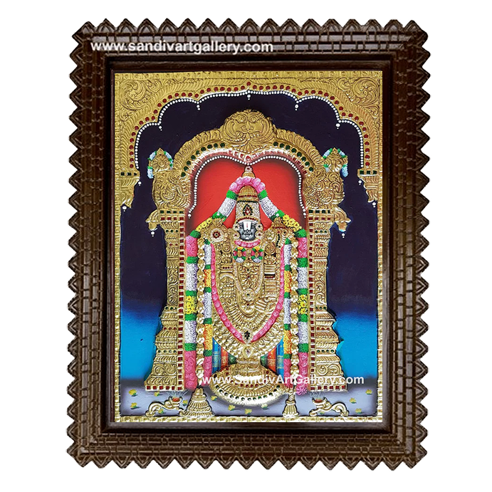 Traditional Handmade Balaji Tanjore Painting made with 22 Karat gold foil, precious & semi precious stones and poster colours. Framed with High quality Teak Wood to add divinity to your pooja rooms.