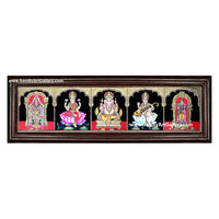 Balaji Lakshmi Saraswathi Vinayahar and Raja Alankara Murugan- 5 God Panel Tanjore Painting - Classic Frame / 10x40