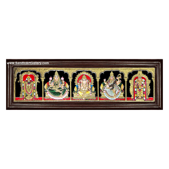 Balaji Lakshmi Ganesha Saraswathi and Murugan- 5 Panel Pooja Tanjore Painting - Classic Frame / 10x40