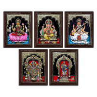 Ganesha Gajalakshmi Perumal Saraswathi and Palani Raja Alangara Murugar- Pooja Room 3D Embossed Tanjore Paintings - Classic Frame / 15x12