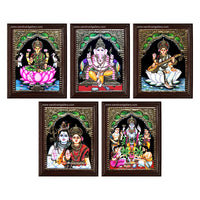 Ganesha Gajalakshmi Saraswati Sathyanaryana and Shiva Parvati- Pooja Room Tanjore Painting - Classic Frame / 12x10