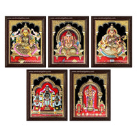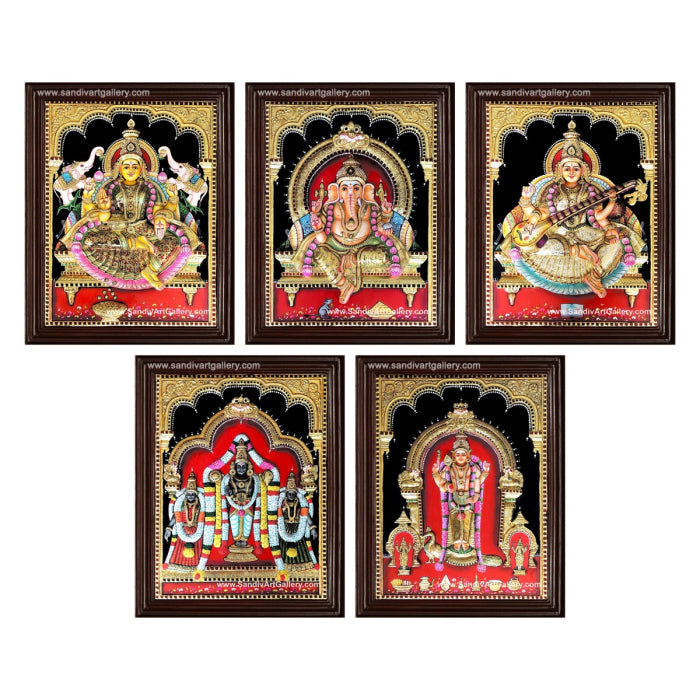 Ganesha Gajalakshmi Vishnu with Sreedevi Boodevi Saraswathi and Thiruchendur Murugar- Pooja Room 3D Super Embossed Tanjore Painting - Classic Frame / 24x18