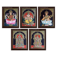 Ganesha Lotus Lakshmi Saraswati Subramanya Swamy and Balaji- Pooja Room Tanjore Painting - Classic Frame / 15x12