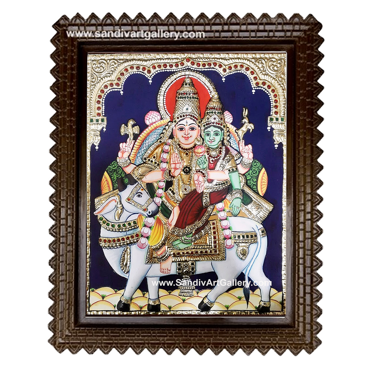 Shivan Parvati Sitting on Nandi Semi Embossed Tanjore Painting
