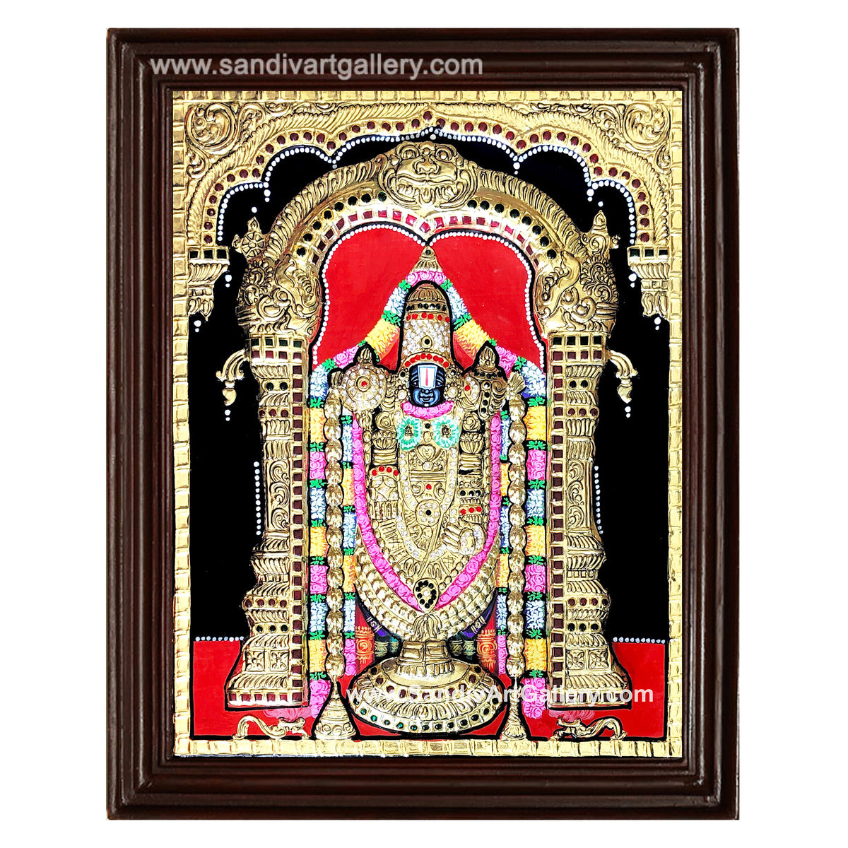 Traditional Handmade Balaji Tanjore Painting made with 22 Karat gold foil, precious & semi precious stones and poster colours. Framed with High quality Teak Wood to add divinity to your pooja rooms.