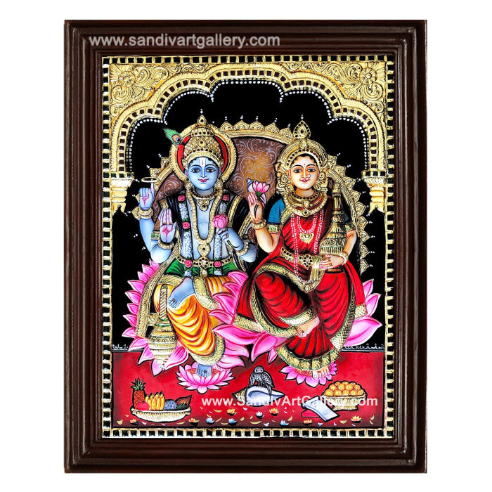 Vishnu Lakshmi 3D Embossed Tanjore Painting - Classic Frame / 15x12